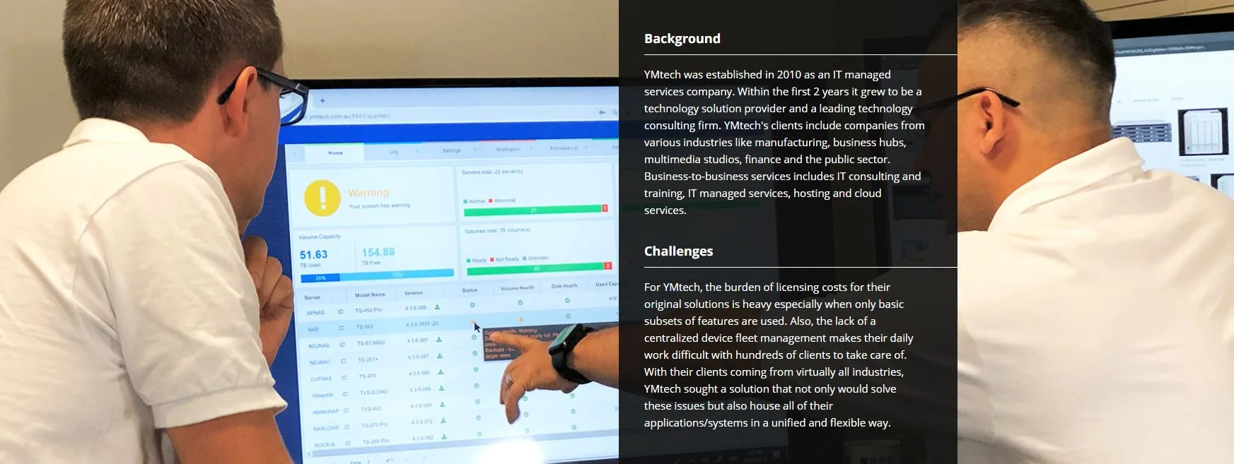 After extensive in-house research, YMtech selected QNAP as their solution provider. Versatile hardware and software are used to solve their challenges - including the TS-EC880U R2 NAS for high-performance storage; the TVS-EC880 NAS and the Q’center solution for centralized device management; Virtualization Station for running VMs, the TS-877 NAS for graphics computing with an optional GPU; and the TS-463XU NAS for offsite storage.